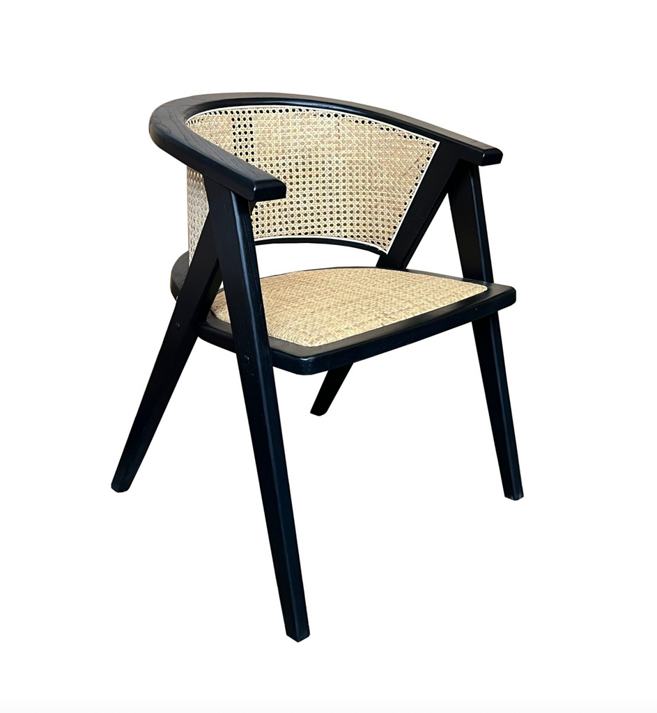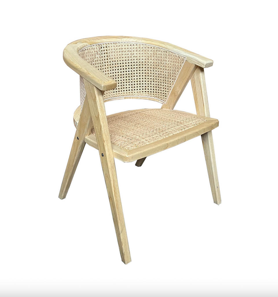A curved cane-back beauty crafted with a solid elmwood frame and hand-woven rattan/reed. The airy arc back brings coastal warmth and everyday comfort to dining rooms, home offices, and nooks. Choose Natural, Antique Natural (a deeper, richer tone), or Black to suit your palette. Compact and sturdy with a 45 cm seat height, it slides neatly under most tables while adding timeless texture and calm, country-coastal character to your space.
