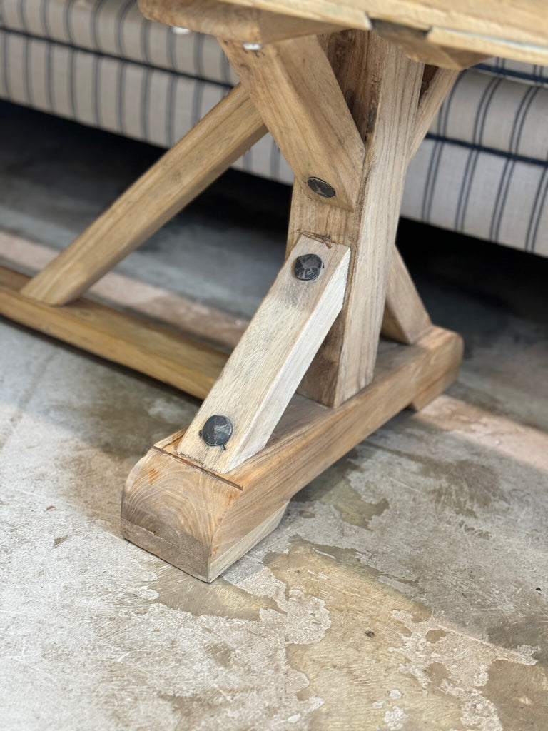 The timber used in the Bordeaux Range is reclaimed elm. This timber was grown at North of China. When the timber is reclaimed it is then bleached, repaired, polished and waxed to give the finish that you see. All the timber used is aged over 100 years. The timber used will have faults, cracks and splits. Timber will then be used to fill these imperfections. This is a natural occurrence of this kind of product. It is by no way a fault and is sourced with this appearance in mind.