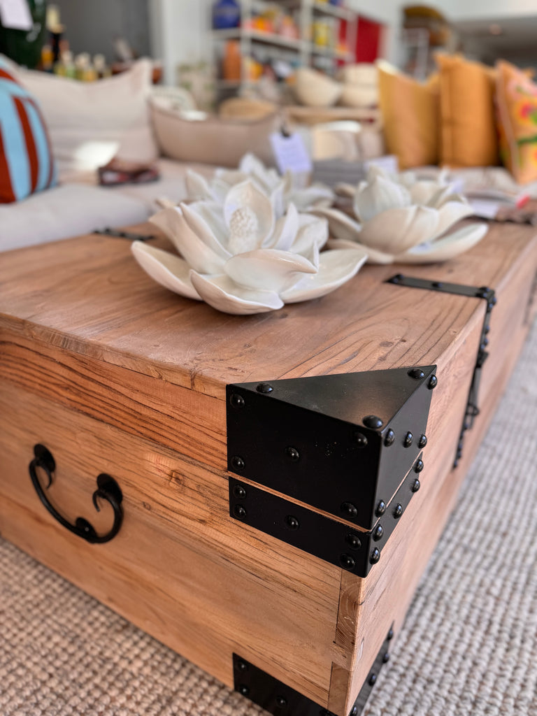 Natural Recycled Elm & Iron Trunk the perfect coffee table and storage for all the bits and pieces.