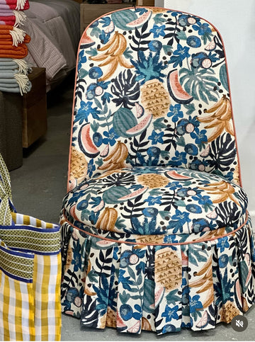 Bring a burst of tropical charm to your home with the Tortuga Accent Chair, upholstered in the stunning Warwick Tortuga Ocean fabric. This statement piece features lush botanical prints and vibrant fruits in rich ocean blues, warm terracottas, and fresh greens — perfectly finished with papaya piping for a pop of contrast. The pleated skirt adds a tailored, elegant touch, making it as refined as it is fun.
