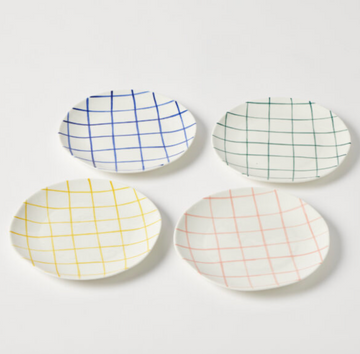 Hand-painted with bold brushstroke check patterns in blue, green, pink and yellow, these New Bone China plates bring expressive style to modern dining.