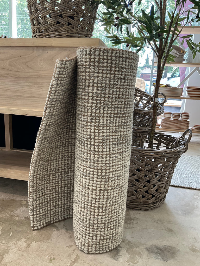 The chunky boucle knit of the white and grey wool is weaved through the jute achieving colour and tone that looks terrific in such a wide range of interior scenarios