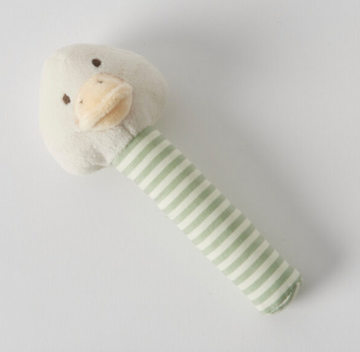 The Stripe Duck Rattle is a sweet and soothing first toy for babies, featuring a plush duck head with embroidered details and a soft rattle sound. The easy-to-grip handle in sage green and white stripes encourages sensory development and coordination in little hands.