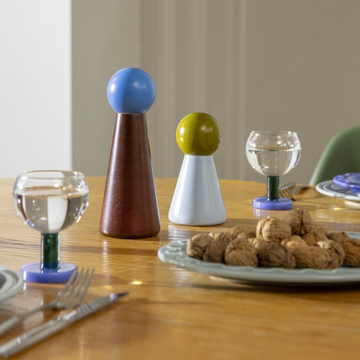 Add playful elegance to your kitchen with the salt & pepper halma mills. Inspired by traditional wooden game pieces, these mills come in four coordinated colors and two sizes. Crafted from FSC-certified rubberwood with a durable ceramic mechanism inside, each mill can be used for either salt or pepper. The colors are applied using a stain that subtly reveals the natural wood grain, then finished with a clear, food-safe lacquer. Create your own charming, vibrant set that’s as fun to use as it is to display.